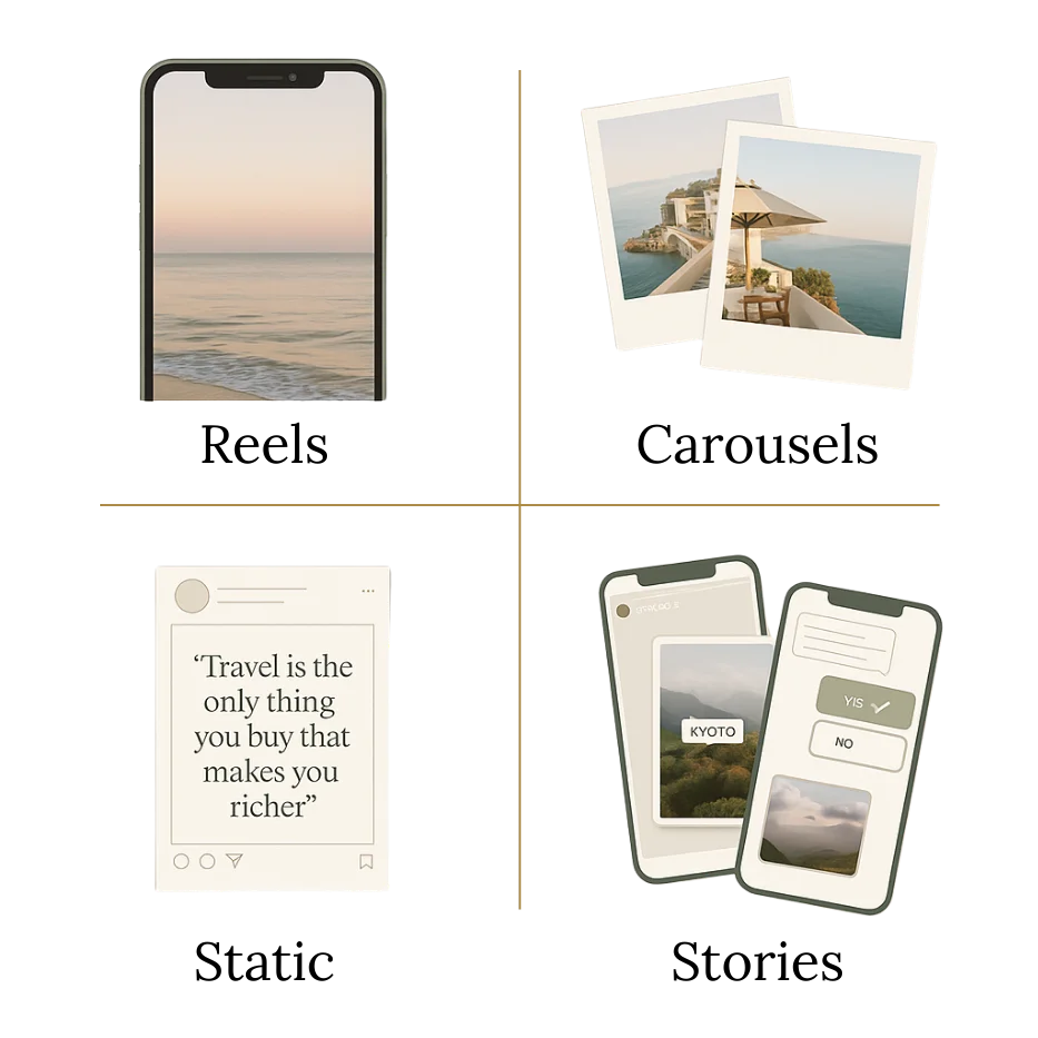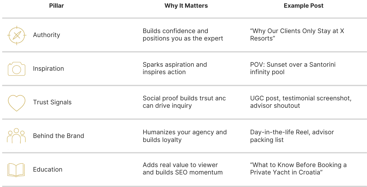 Your content should reflect the same refinement, consistency, and thoughtfulness you bring to your client experiences. A beautifully curated Instagram feed or LinkedIn presence isn’t just visually appealing—it’s a storytelling platform that reinforces trust before a word is spoken. For luxury travel agencies managing multiple advisors, voices, or destinations, anchoring your content in clearly defined pillars ensures that everything you post has purpose and cohesion.